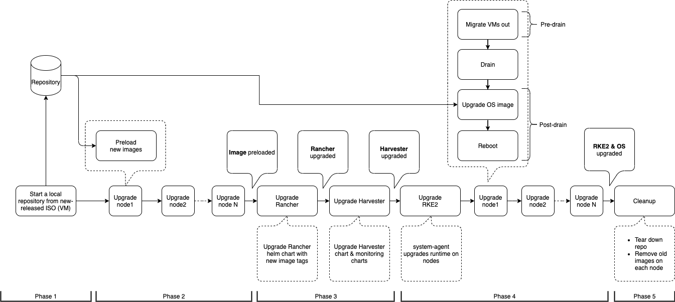 - pre-drain job: live-migrate or shutdown VMs on a node. When the job completes, the embedded Rancher service upgrades RKE2 runtime on a node.